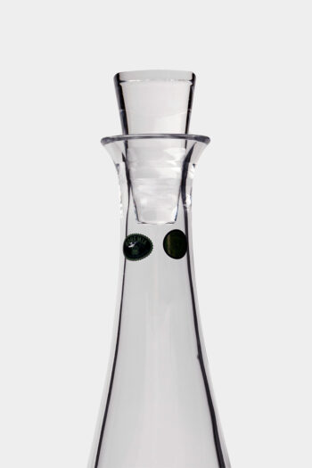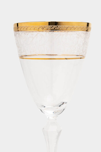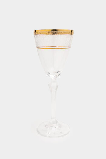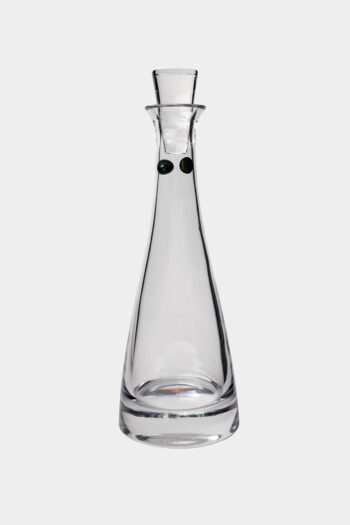 Διαφανής κρυστάλλινη καράφα με στενό λαιμό ,χρυσή ρίγα στο χείλος και σκάλισμα. Κατάλληλη για κρασί αλλά και για λικέρ κατασκευασμένη στην Ιταλία. Το μείγμα γυαλιού Luxion είναι φιλικό ως προς το περιβάλλον καθώς είναι πλήρως απαλλαγμένο από μόλυβδο.